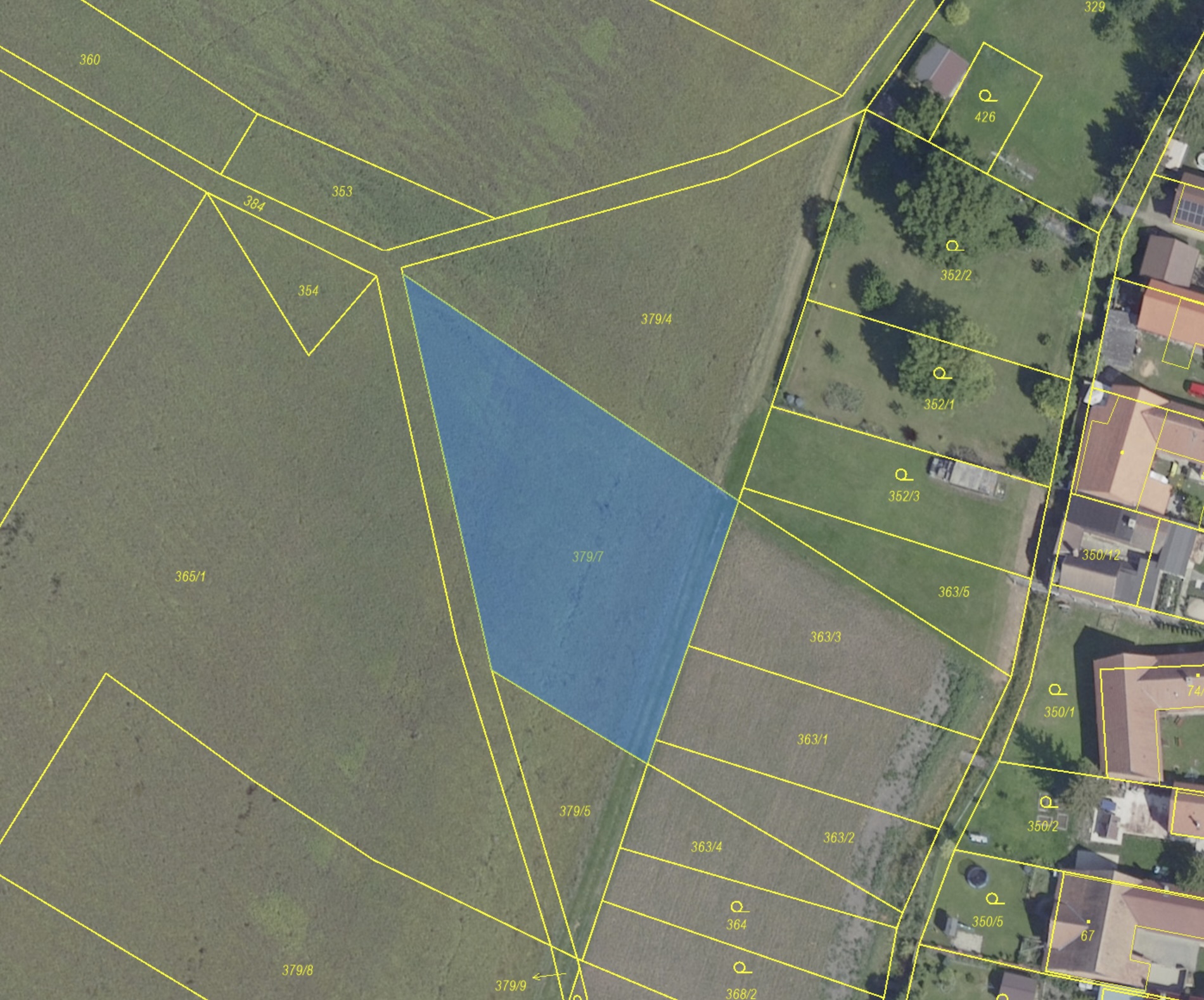 Prodávaná parcela číslo 379/7 je vedena na listu vlastnictví číslo 1777 a má celkovou velikost 1727 m2. Parcela je přístupná přes obecní parcely a zároveň se počítá s vybudováním přístupové cesty pro rodinné domy dle zmiňovaného návrhu změn Z6 územního plánování obce.